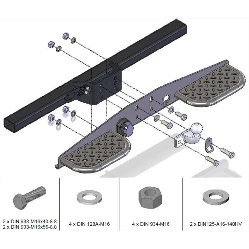 Le marchepied se fixe sur la platine de fixation des attelages à rotule « standard » ou « rotule en D ». Cette rotule n’est pas livrée avec le marchepied.