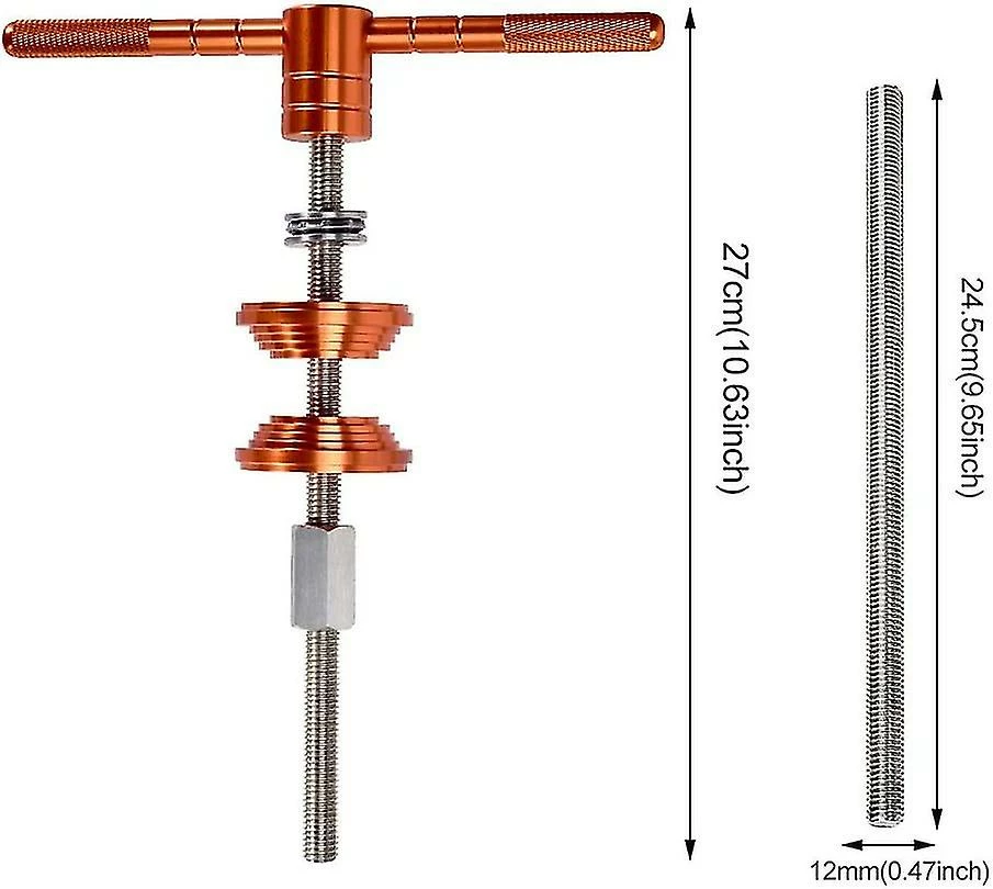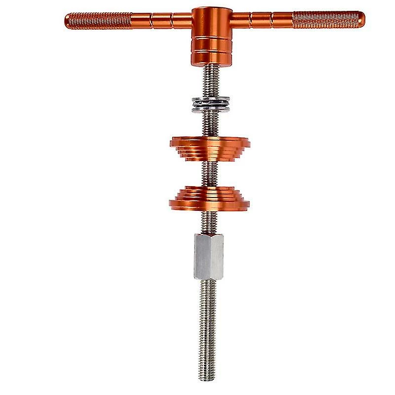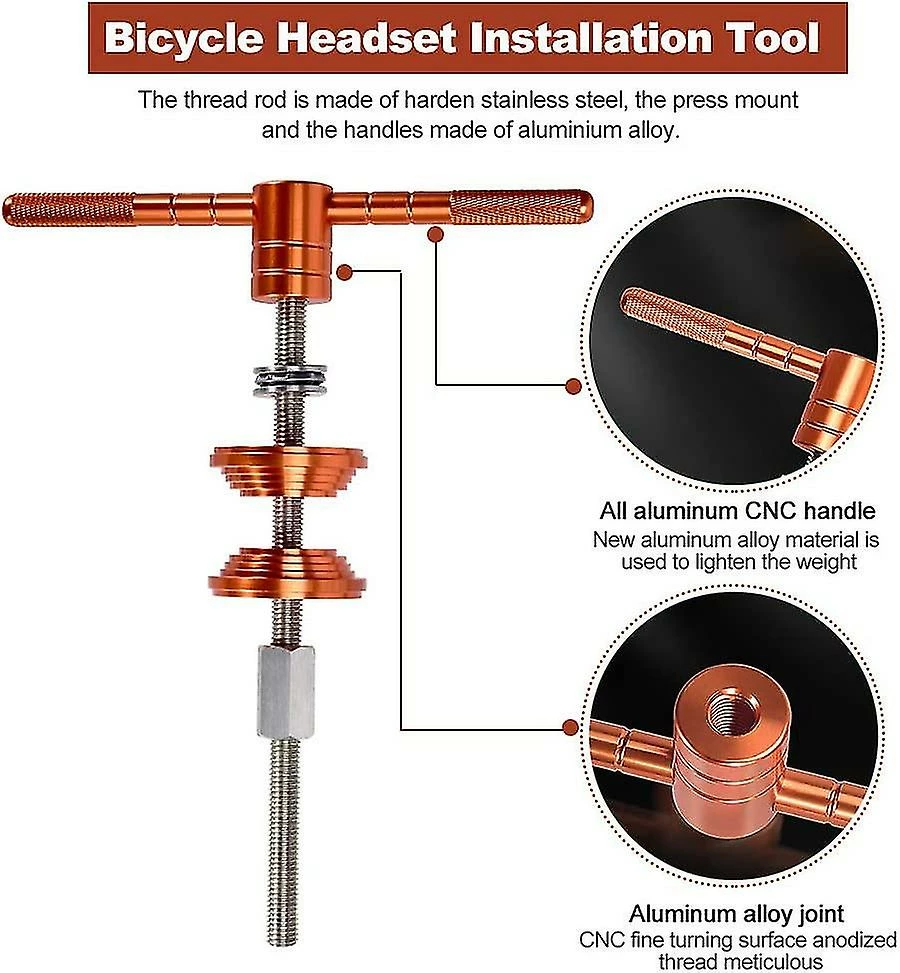 ZDD MaterialThe thread rod of this mountain bike headset tools cycling bottom bracket install removal tool is made of harden stainless steel,the press mount and the handles made of aluminium alloy Easy InstallBicycle headset bottom bracket is perfect tool for helping you to replace your bike old torn part,easy to use,convenient to install. Ball Bearing DesignBall bearing design makes it more stable while using and would not hurt your bike frames. Press Block DesignThis bike bottom bracket press installation tool is adopt pressure block design,the reverse side is used to assemble the press-in bottom bracket,and the sinking table is designed to avoid crushing the bearing during installation. Delivery Quantity: 1pcs Product color: orange Product size: 260*210MM