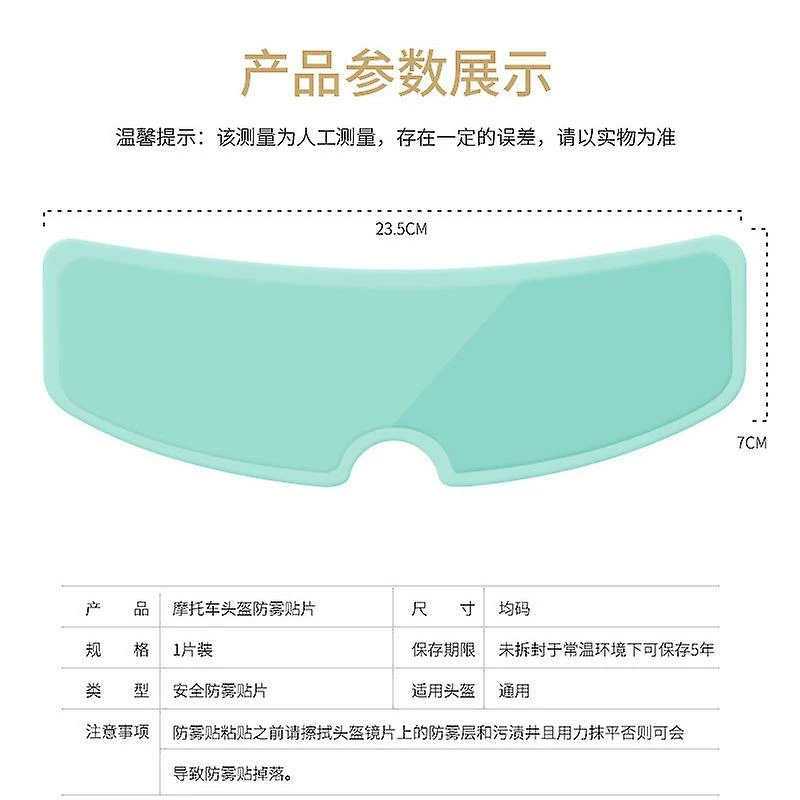 Casque anti-buée et film de pluieCasque applicable: UniverselApplication: Autocollant intérieur: anti-buée, autocollant extérieur: imperméableMatériel: Nanodécrire: 1. Le film antibuée est constitué de matériaux de structure moléculaire spéciaux. Après mouillage avec de l’eau, l’effet antibuée ne diminue pas. Rincer à l’eau et essuyer avec un chiffon pour une utilisation continue.2. Patch de casque universel plein cadre, vieillissement antibuée à long terme pendant plus de 3 ans3. Une bonne transmission de la lumière facilite la conduite et réduit la fatigue oculaire